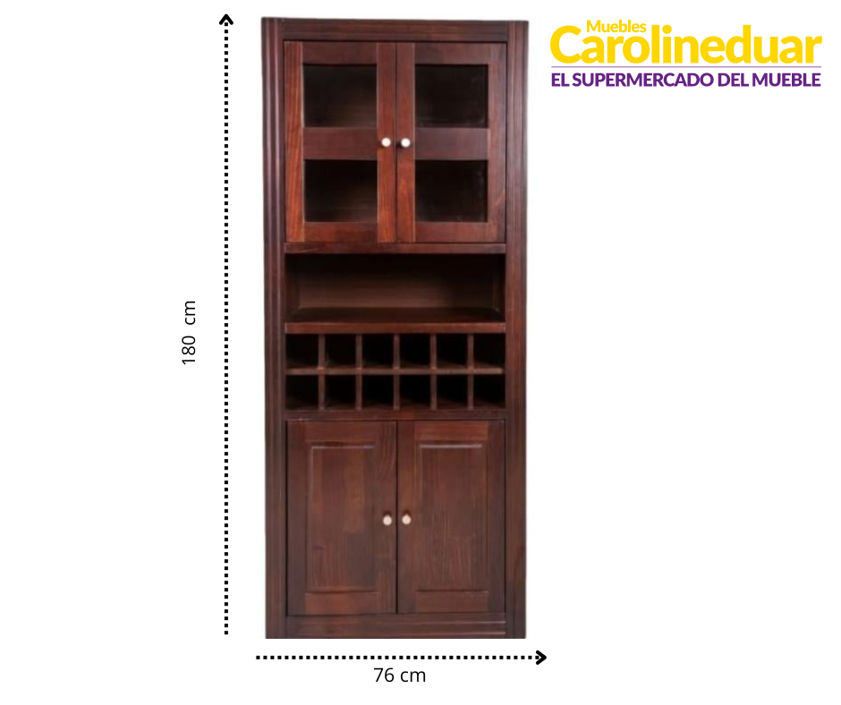 Bar Berlín Insigne Chocolate A180Xan80Xpr 38 Mueble bar de 2 cuerpos. Incluye: puertas superiores con aplicación de vidrio, puertas inferiores de madera solida, además incluye repisa y espacio para 12 botellas. Dimensiones Alto: 180 cm Ancho Fondo: 37 cm Largo/ancho: 76 cm Peso: 53