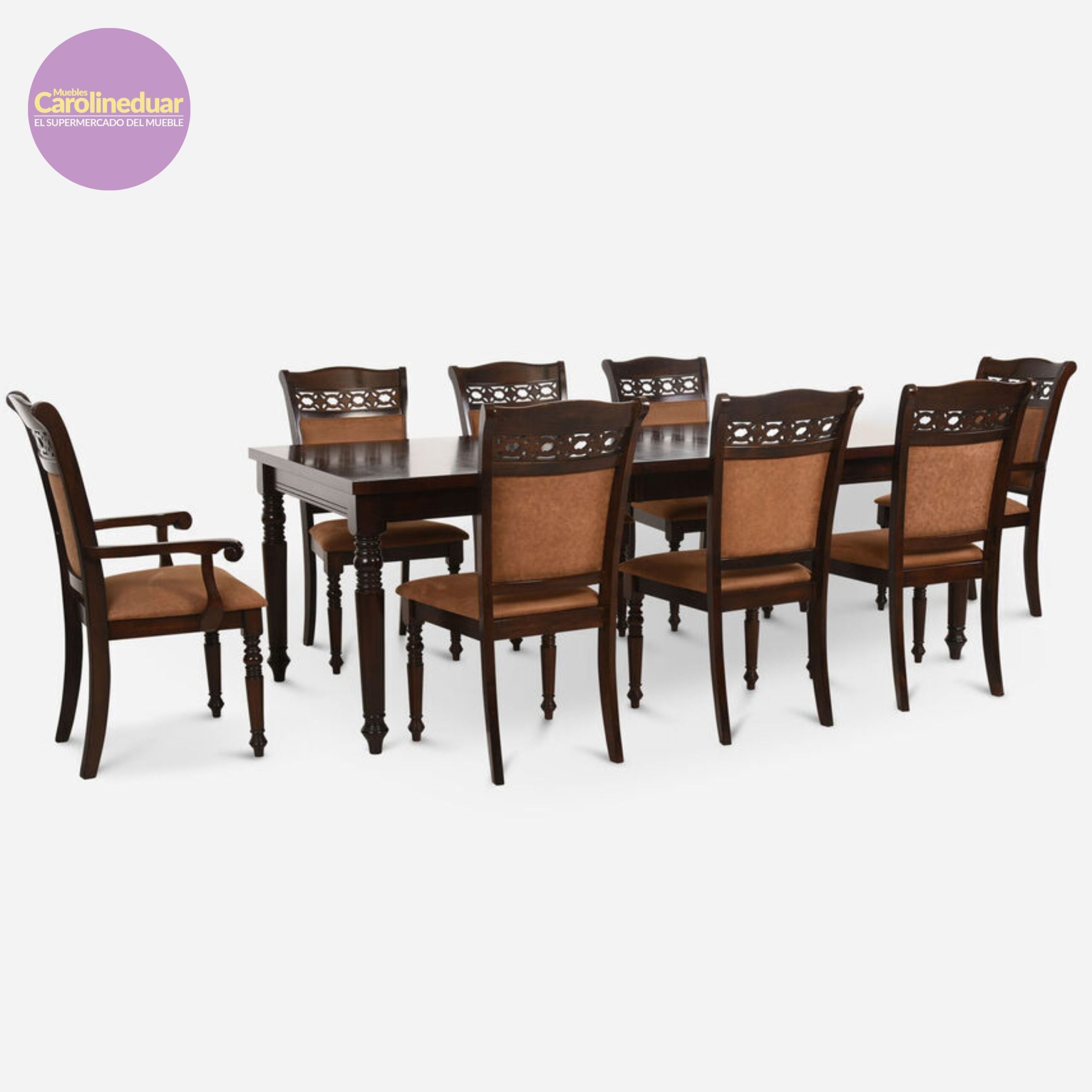 Comedor estilo clásico apto para 8 personas ideal para espacios amplios. Compuesto por 6 sillas y 2 sitiales además la mesa cuenta con extensión fija. Destaca por sus patas finamente torneadas y sus sillas robustas entregando un gran confort.