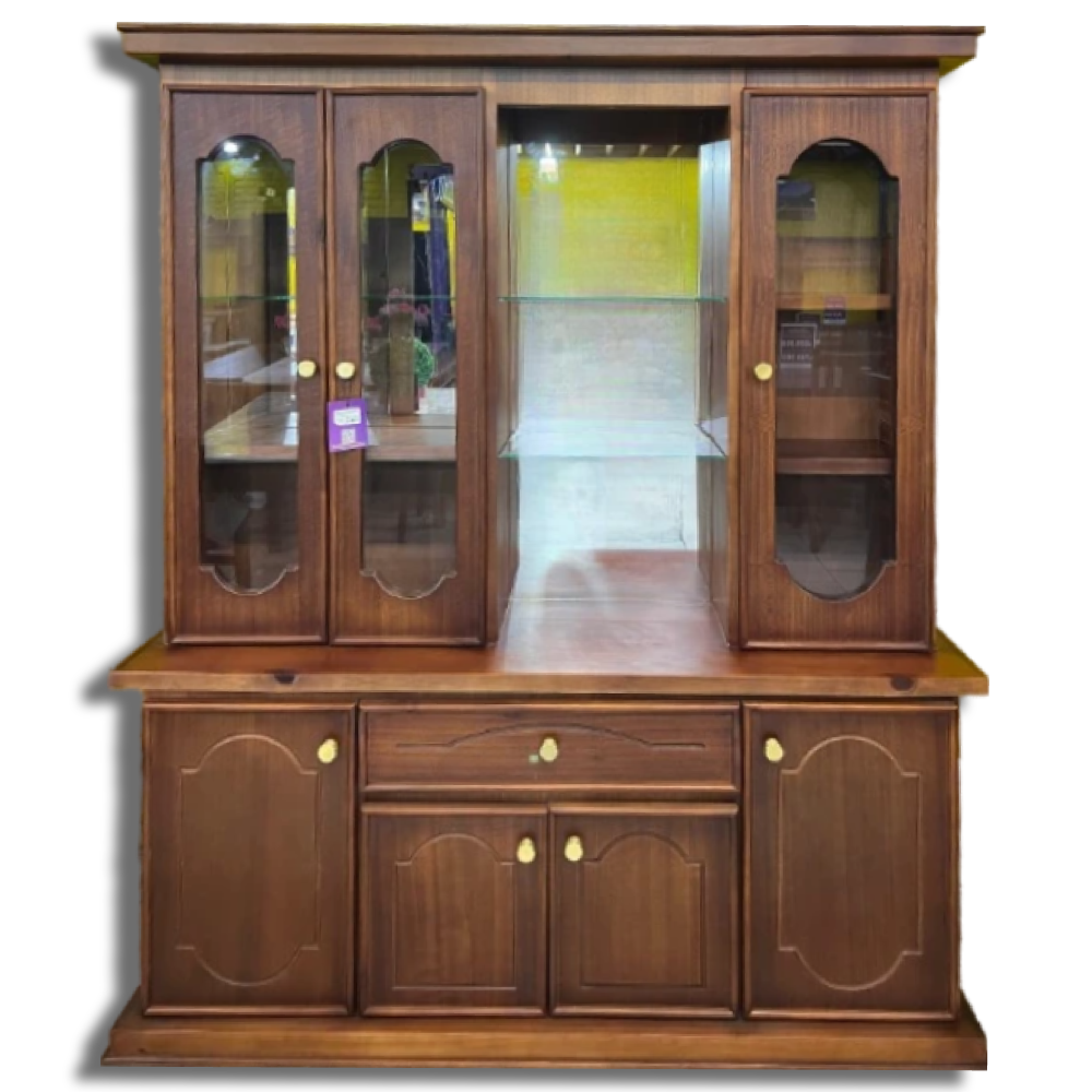 La vitrina Roma combina estilo clásico y funcionalidad para resaltar tus piezas favoritas. Fabricada en madera de tono cálido, cuenta con cuatro puertas superiores de vidrio con detalles decorativos, perfectas para exhibir vajilla, cristalería o decoraciones. Su área central abierta con estantes de vidrio añade un toque sofisticado y elegante. En la parte inferior, encontrarás cajones y puertas de almacenamiento que ofrecen amplio espacio para organizar utensilios, manteles o cualquier elemento que desees guardar. Una pieza ideal para aportar un aire distinguido a tu comedor o sala.