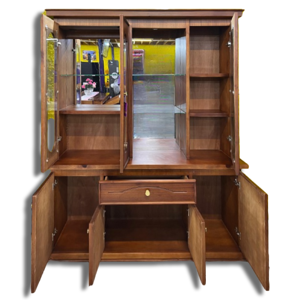 La vitrina Roma combina estilo clásico y funcionalidad para resaltar tus piezas favoritas. Fabricada en madera de tono cálido, cuenta con cuatro puertas superiores de vidrio con detalles decorativos, perfectas para exhibir vajilla, cristalería o decoraciones. Su área central abierta con estantes de vidrio añade un toque sofisticado y elegante. En la parte inferior, encontrarás cajones y puertas de almacenamiento que ofrecen amplio espacio para organizar utensilios, manteles o cualquier elemento que desees guardar. Una pieza ideal para aportar un aire distinguido a tu comedor o sala.